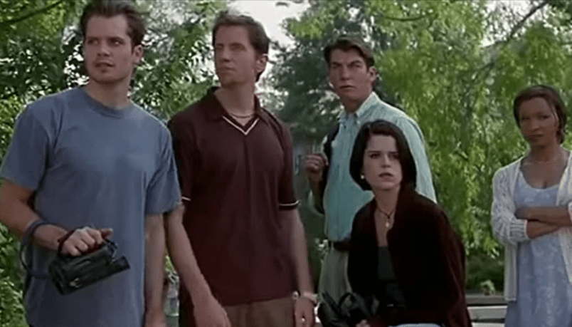 The biggest take away from Scream 2 is that there are a FUCK TON of people in this movie. The core returning cast of Neve Campbell, Courtney Cox, and David Arquette are joined by Jada Pinkett Smith, Omar Epps, Heather Graham, Lieve Schrieber (for real this time), Timothy Olyphant, Sara Michelle Gellar, Jerry O’Connell, and Luke WIlson. Just a whos who of the late 1990s.