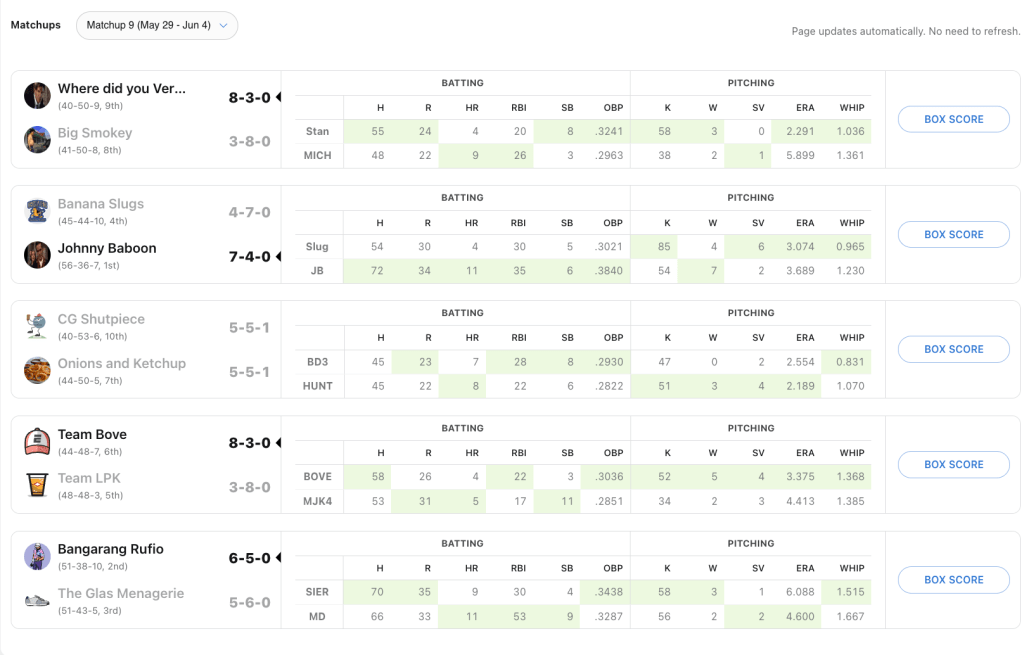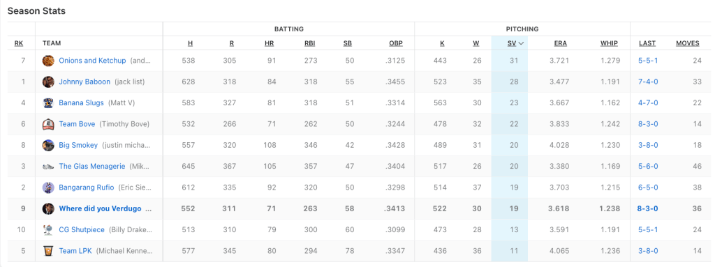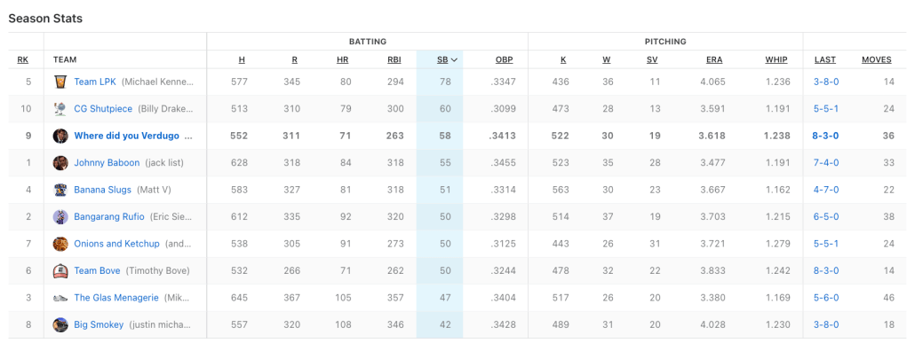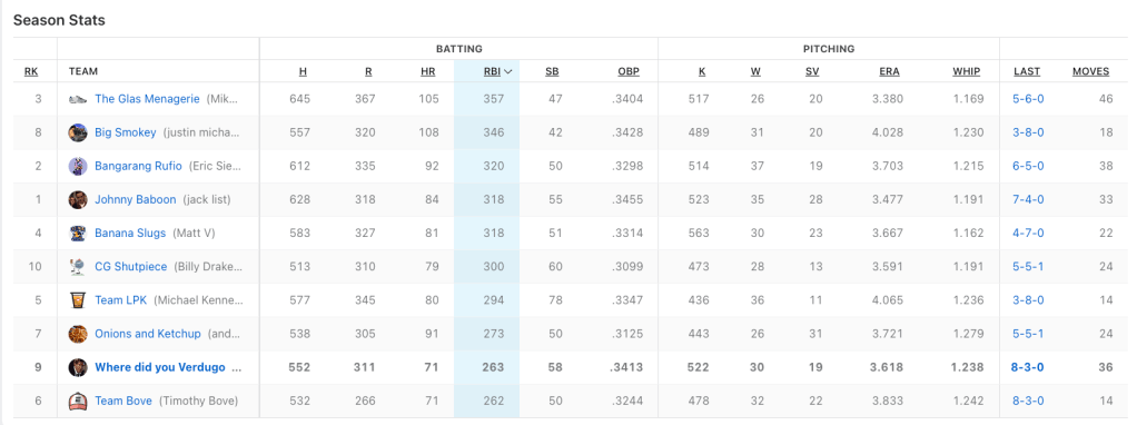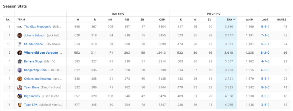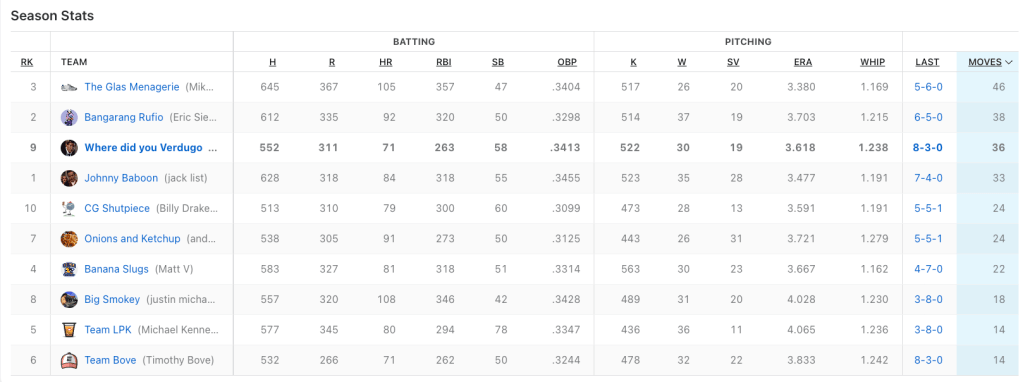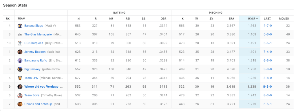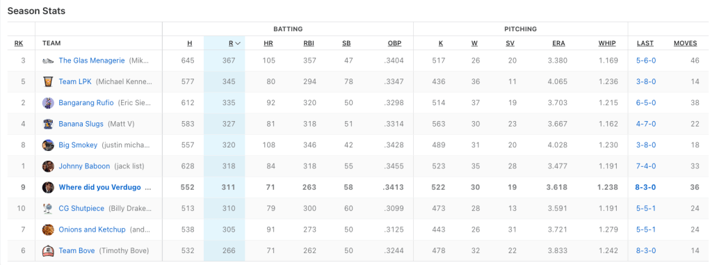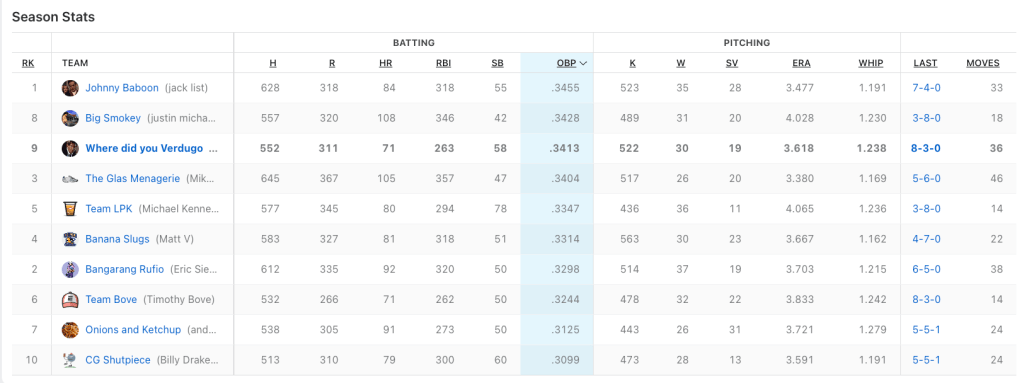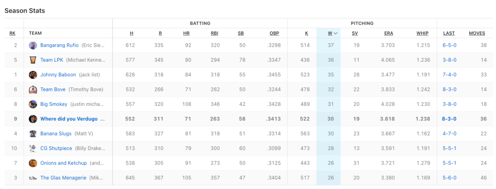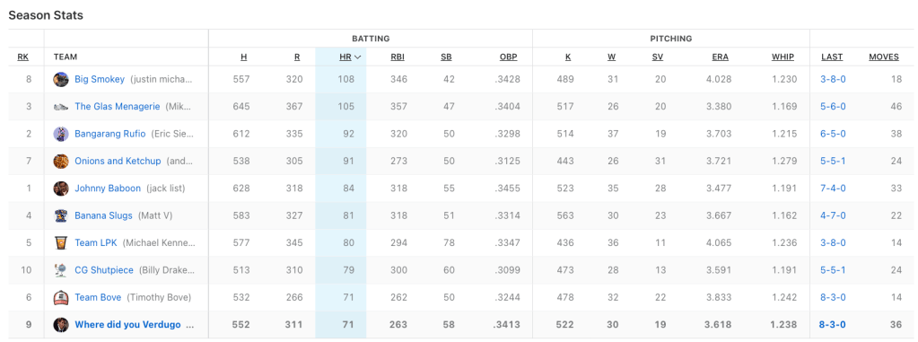 Now that we are nine weeks in, we are officially halfway through this fantasy baseball season. The top of the standings have been mainly with the same five teams fluctuating between positions. Vaghi started out red hot but has cooled down as a season that has progressed. Michael has stayed in that playoff picture the entire time. Jack List has been the hottest team over the past four weeks, but Eric and DiMaio are starting to make moves. Well, at least from my POV writing these recaps all the time.