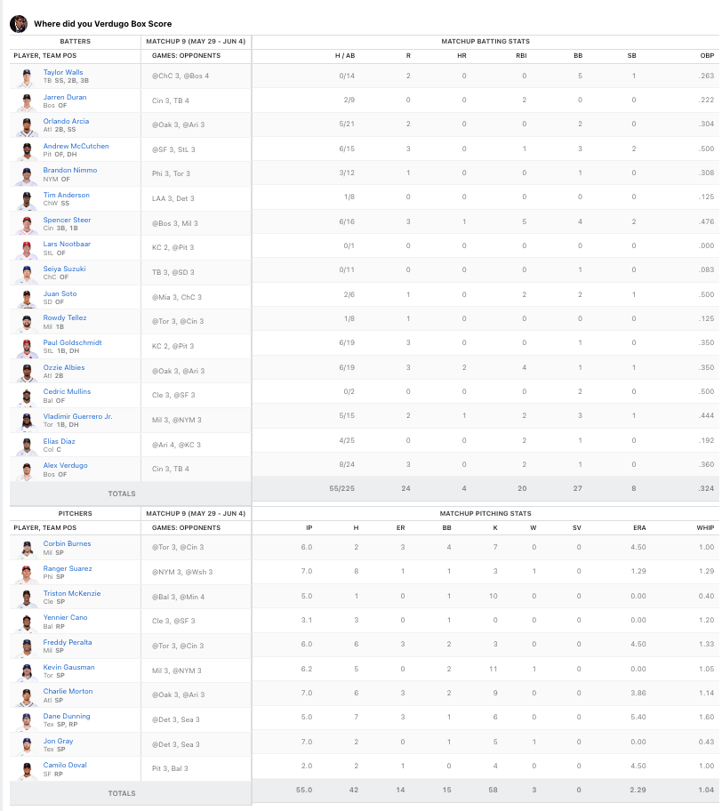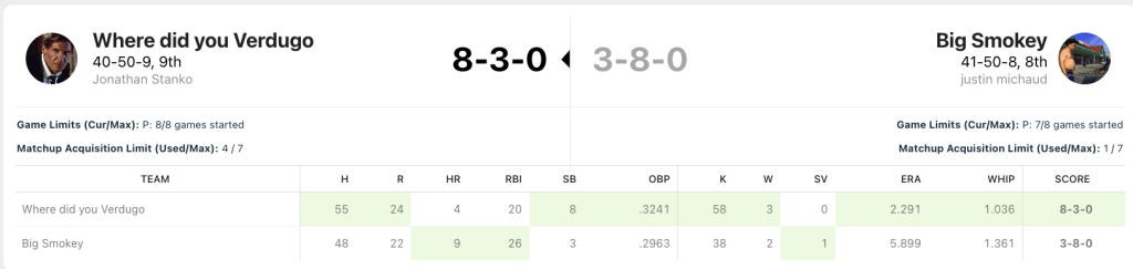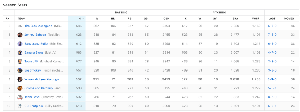 Alex Verdugo led my team with eight hits. Nice of him to get hot again. I also had six hits each from Andrew McCutchen (good week pick-up by me), Spencer Steer (another good pickup), and Paul Goldschmidt. 55 hits ranked middle of the pack, but it was good enough to take down Michaud. He had seven hots from Teoscar Hernandez, and six from Gleyber Torres. Nobody else had more than five.