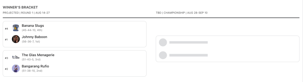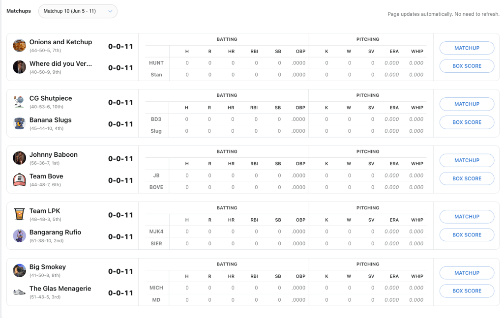 Will somebody come up from the bottom of the standings and start to make moves? Is it Bove, who started off as the worst team in the league but has steadily been on the rise ever since. Is it Huntley, who is sitting just behind the Bove man the lesser men currently?
