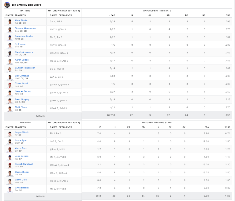 This category could have been Judge against my entire team, and Judge would win. He had five hits during the week, but four of them would be big dingers. And the tie goes to the solo guy in this scenario. Marte of Arizona had two home runs to help put him over the table.
