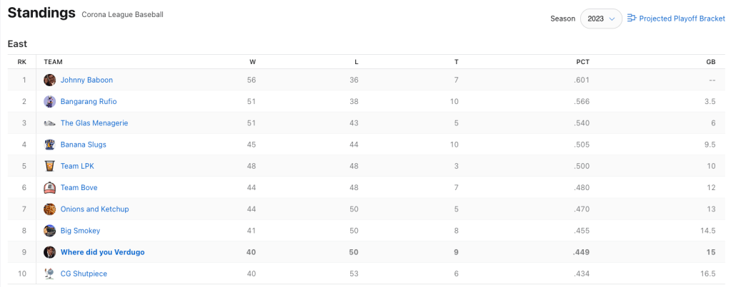 I wish ESPN Fantasy Baseball had the playoff projections column of the standings like ESPN Fantasy Football does. Shake my head.