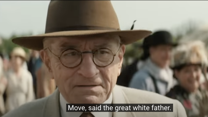 In this trailer for Killers Of The Flower Moon, the evil white folk are described as wolves. The trailer ends with a bunch of white people in a low lit room and Ernest Burkhart’s voiceover asking “Can you find the wolves in this picture?”
