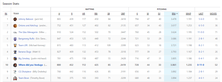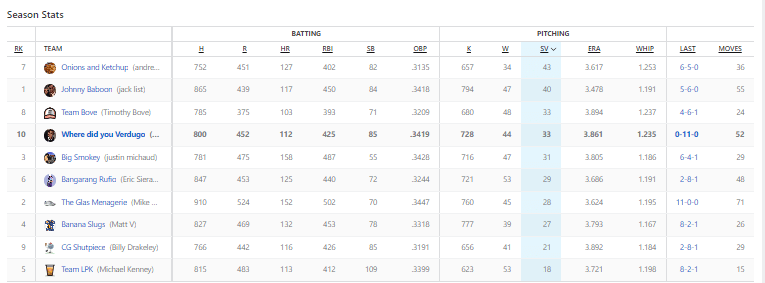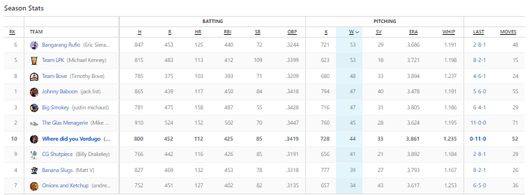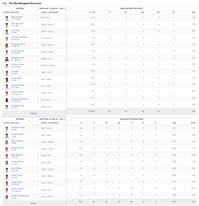 I have a pitcher who had a 23.63 ERA this week. What makes it worse is that I picked him up to fill in my eighth starting pitcher spot. So between MacKenzie Gore and the disappointing Johan Oviedo, my team was royally fucked. At least Paxton pitched well for the Red Sox, and me. Paxton threw 7.2 shutout innings. DiMaio on the other hand had just a reliever with a 10+ ERA, so the effect of a bad outing doesn’t have as much of a lasting impact. Montgomery pitched 13.1 innings and had only one earned run allowed. A 2.83 ERA is really good, so he deserved to win regardless.
