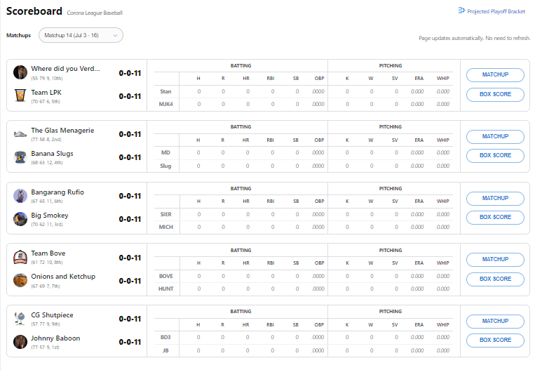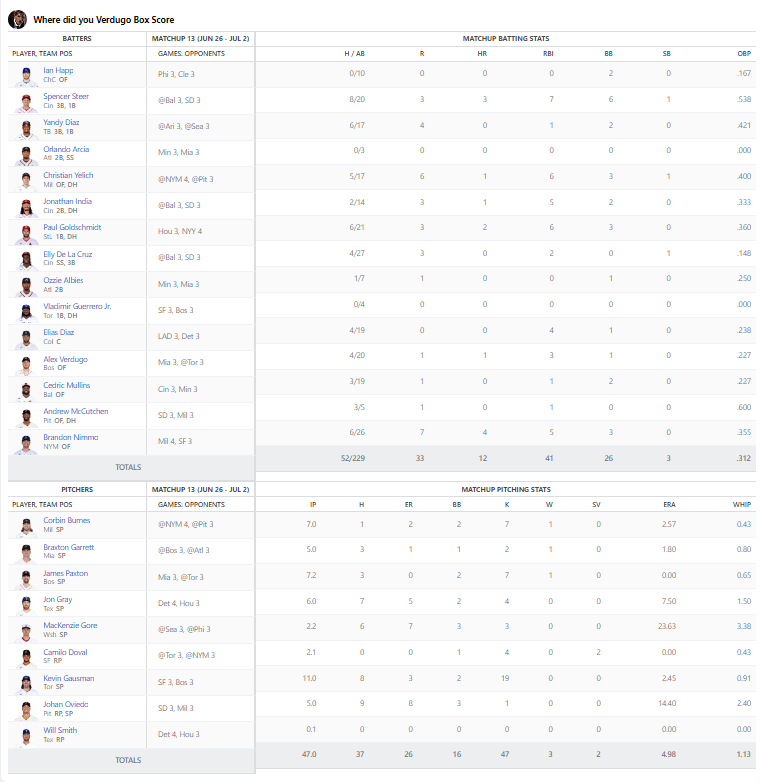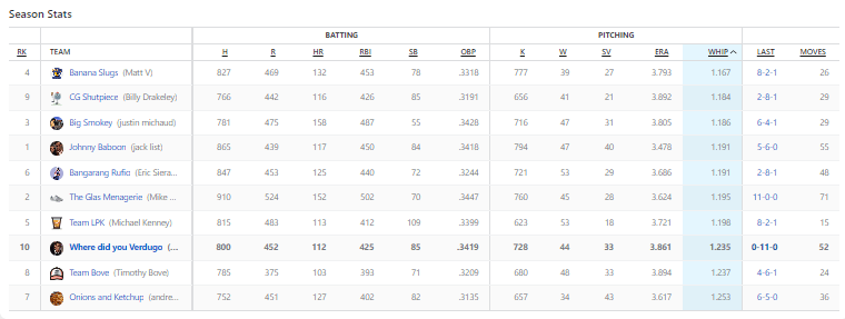 Is it bad that even after writing a dozen or so of these write ups, I don’t know if one tenth is a huge difference in terms of WHIP? For myself, the losing team, Corbin Burnes, Kevin Guassman and Paxton all had sub-one WHIP. There efforts are fucked with there are two pitchers on the staff with 2.40 and 3.38 WHIP lines, respectively. Charlie Morton, Detmers, Ohtani and Montgomery were starters with under one WHIP for DiMaio. Impressively, Pressly didn’t allow a single hit or walk in his three appearances.