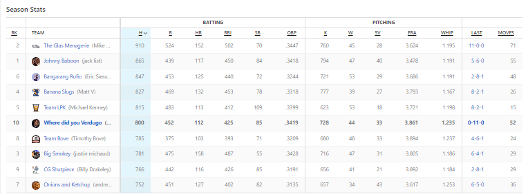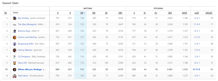 Heading into the final day of the massacre, my team was at least throwing some good haymakers. DiMaio and I were tied with 10 home runs each, but on the final day the best hitting team in the league ensured his reputation did not die. Ozzie Albies, Fernando Tatis Jr., Ohtani and Lowe had home runs on the final day to secure the column.