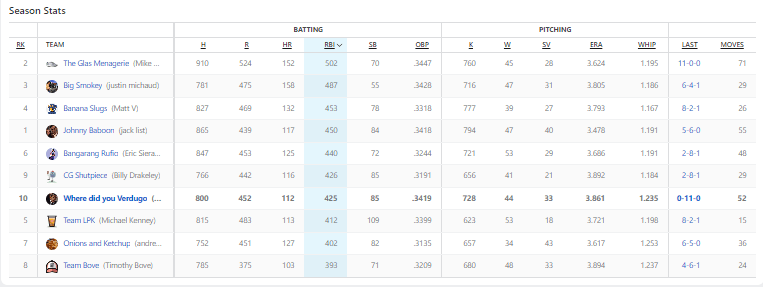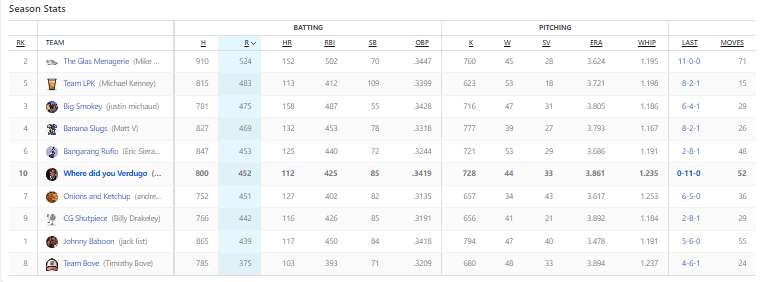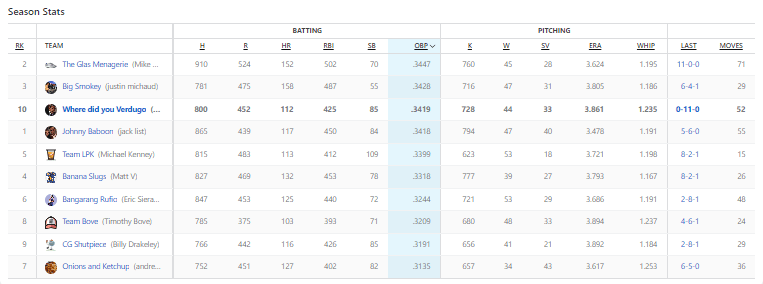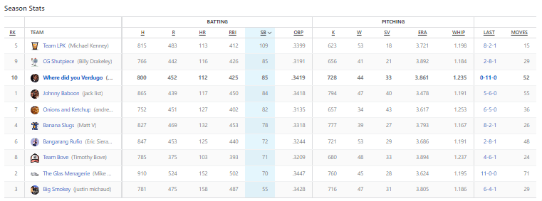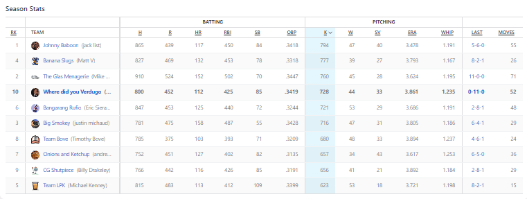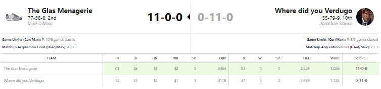 I sound like a groveling child saying that this matchup should have been closer than the 11-0 beating. Again, heading into Sunday I was actually leading in this category. I was up by two (if I did the match right), but between only four hits from my team I ended up with just three RBIs. Meanwhile, DiMaio’s team put on a hitting clinic with six RBIs. For the week, DiMaio had four players with five RBI. My third baseman Steer led all players with seven runs batted in, and fuck it, I had Yelich and Paul Goldschmidt with six each. This is really depressing to write about.