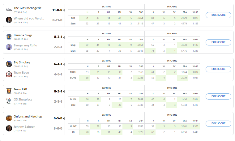 Six wins is a good week for anyone. You are going to win most weeks when you have six wins. DiMaio got the Ws from Morton, Suarez, Detmers, Ohtani and two from Montgomery. I had three wins coming from Burnes, Miami’s Braxton Garrett and Boston’s James Paxton.