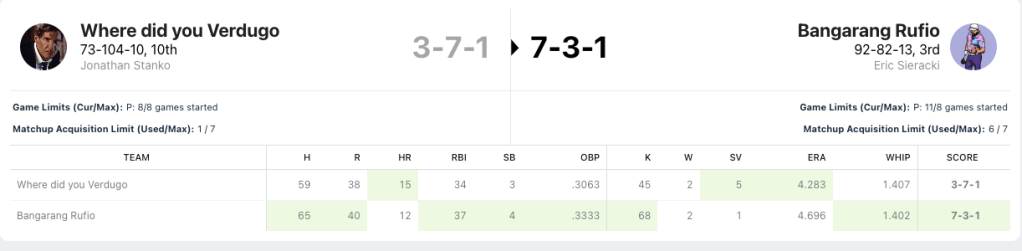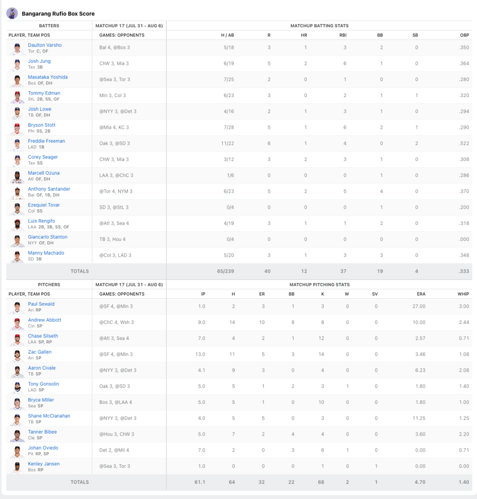 While I had Happ with a matchup-leading seven RBI, it was the steady performance of Eric’s team that carried him to the RBI victory. Jung and Scott had six RBI, and Santander had five. Every player that had more than 10 at-bats had at least one RBI. I mean on my front every player I played had an RBI, but not enough big-bopping hits.