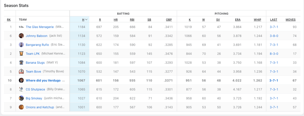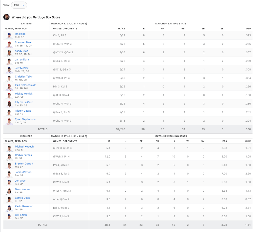 No one on my team had double digit hits. Christina Yelich led the charge for me with nine hits and Yandy Diaz had eight. Ian Happ, Jeff McNiel (who I forgot I had to pick up) and Paul Goldschmidt had six hits each.
