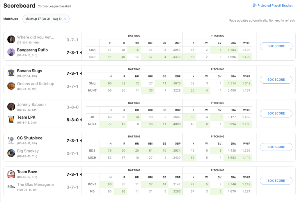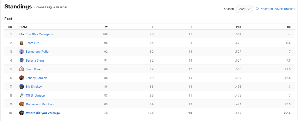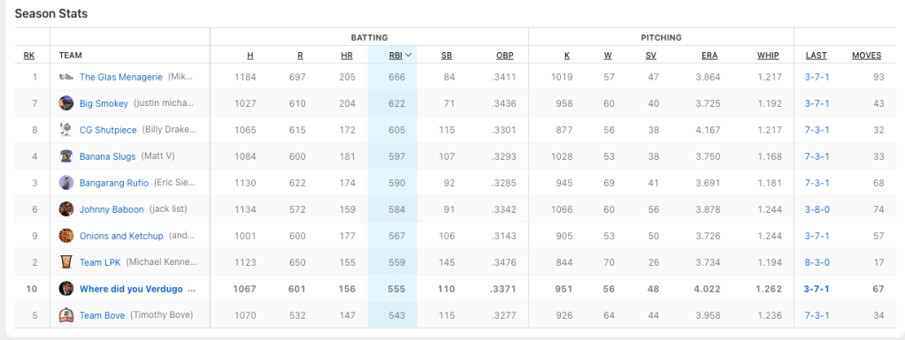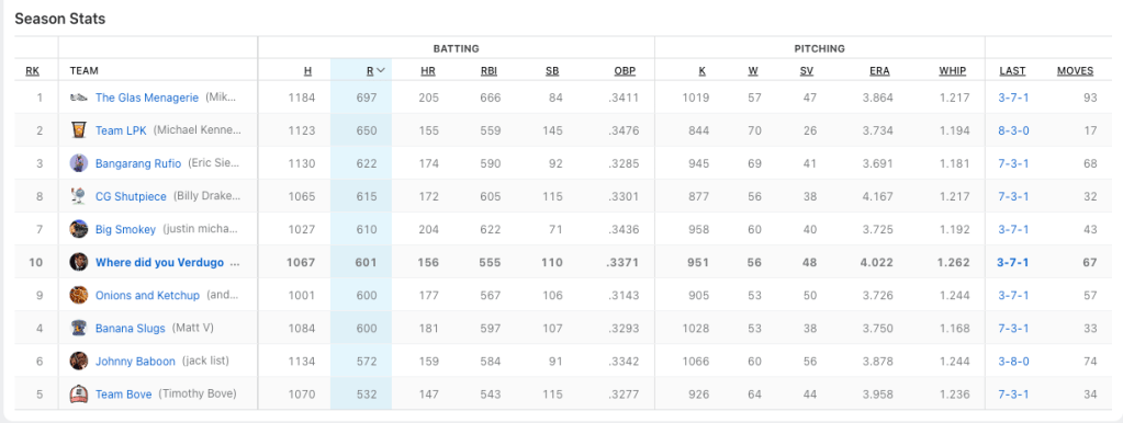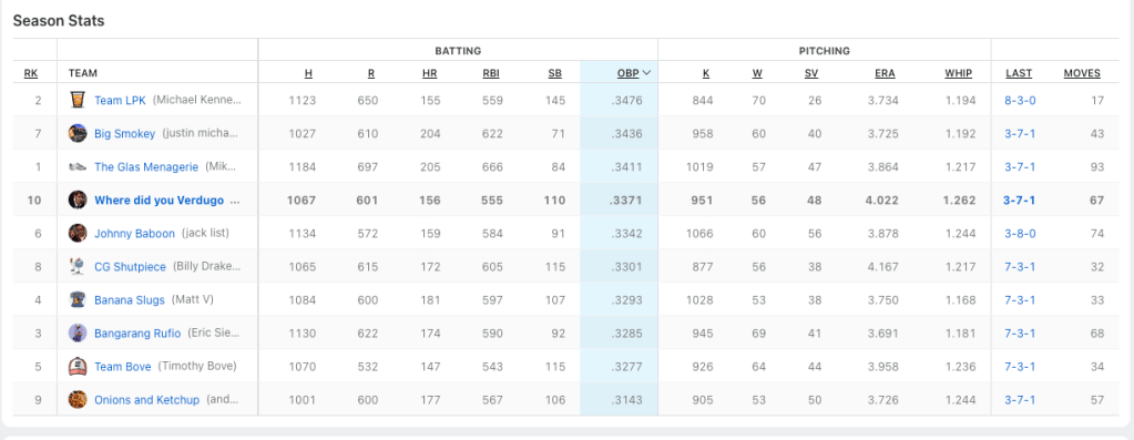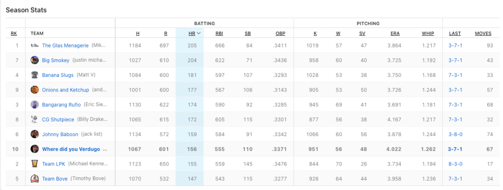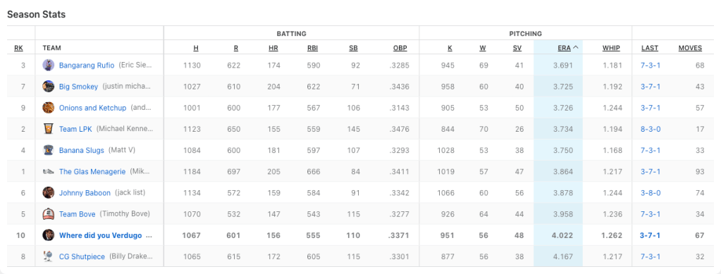 Yikes, gross, incompetent. Both Eric and I’s pitching staffs did not do well toeing the rubber. Somehow I won this category with a 4.283 ERA, beating out Eric’s 4.696.