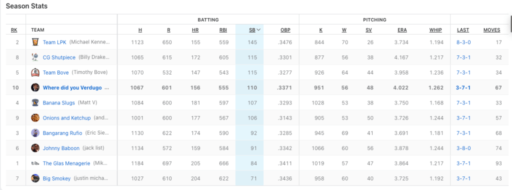 I love Jarren Durran. He is the only thing about the Red Sox I like right now. He led my team with two steals, but his teammates had just one steal. Thank you Yelich. You have been good since I traded for you. Eric was able to squeak this category by me because of Tommy Edman, Scott and Freeman combining for four bags stolen. It was Edman who gave Eric the win on the final day.