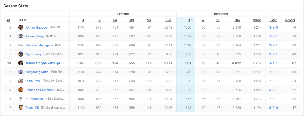 On Sunday Eric used this loophole to perfection, tossing four starters when he had only one starter left. Those four starters totalled 36 strikeouts. Bryce Miller and Chase Silseth had 10 and 12 strikeouts apiece. In the end he won the strikeout category by 28 over myself. It was a bloodbath.