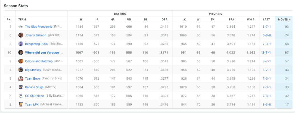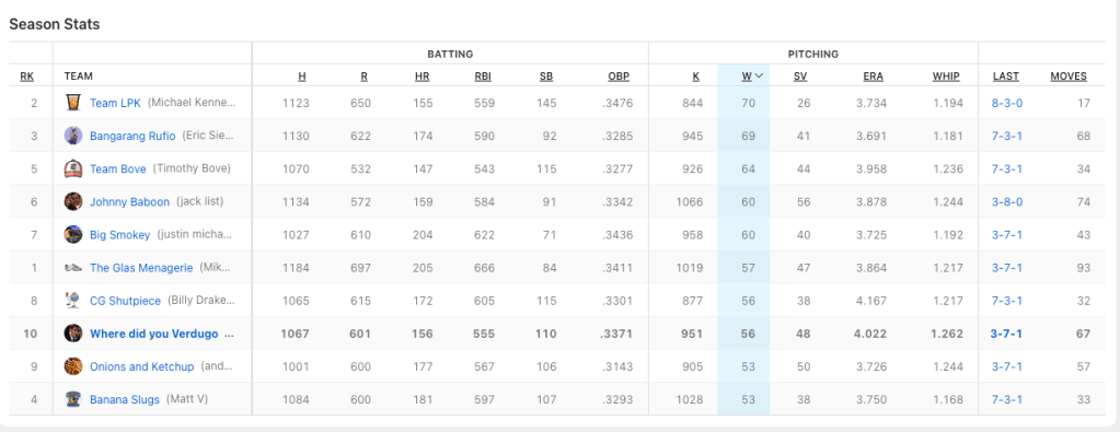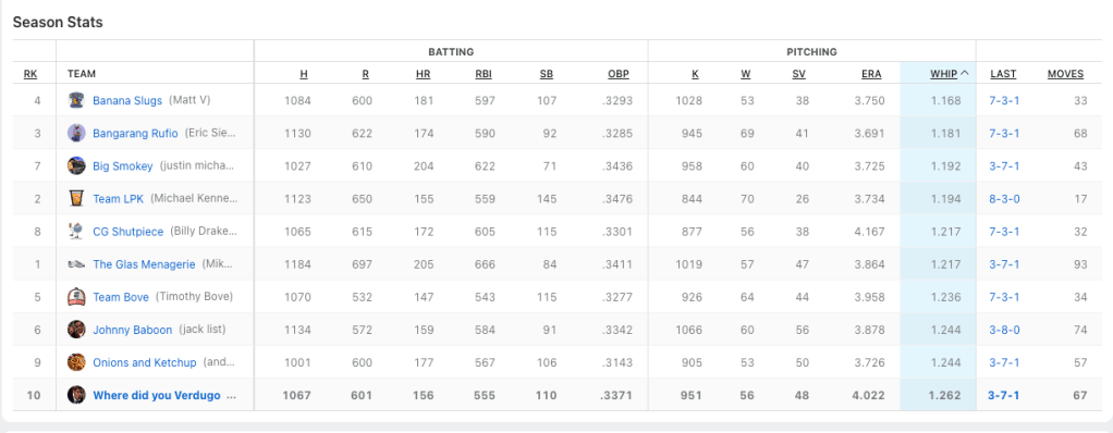 My best WHIP performer was my closer Doval, but in terms of starters its again Burnes who tossed everything out there to a 1.08 clip. Eric’s top WHIP performers were Oviedo and Silseth, both of whom had 0,71 WHIPS during their Sunday starts. I suppose it also helps that Zac Gillen of Arizona had a 0.86 WHIP in his start against Minnesota.