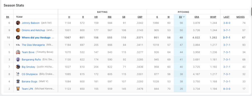 I had five saves this week, second most of the week. A damn good week. Somehow I got three saves from Will Smith despite him having a 6.00 ERA. Not sure he or I deserved the saves, but this is baseball. Camilo Doval just continues to be steady Eddy with two saves in three shutout innings. Eric had one save from Kenley Jansen. The Red Sox stink so he didn’t get many chances. Arizona new closer Paul Sewald threw an inning and allowed three earned runs. Yikes.