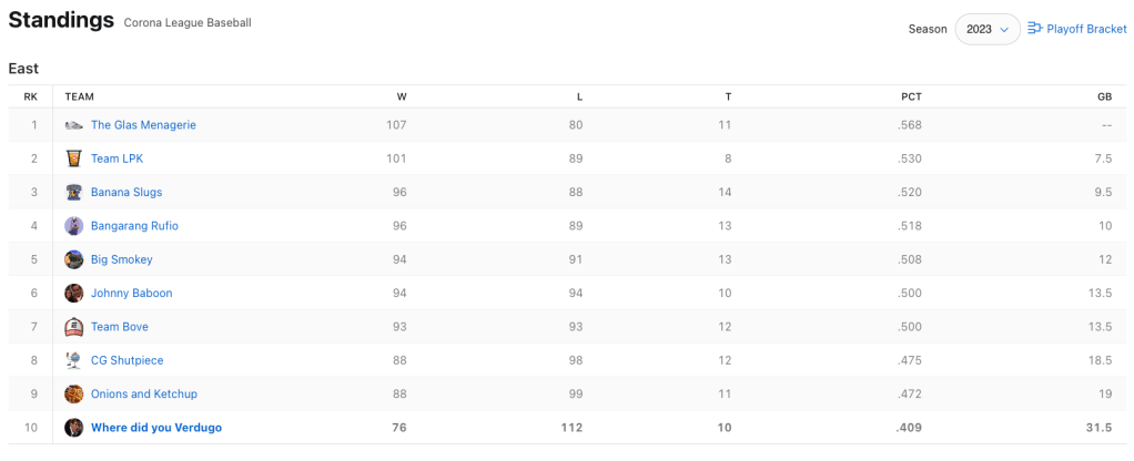 Let’s keep it short and sweet for my terrible team. My MVP of the week is Christain Yelich. The Brewer outfielder arrived on my team more than halfway through the season but he tied Cedric Mullins for my personal MVP awards. This week he had five runs, a team-high six walks and a team-high .467 OBP. He had three RBIs on eight hits and then pitched in a team-best two stolen bases. Yelich is back to being a good baseball player. We love to see it.