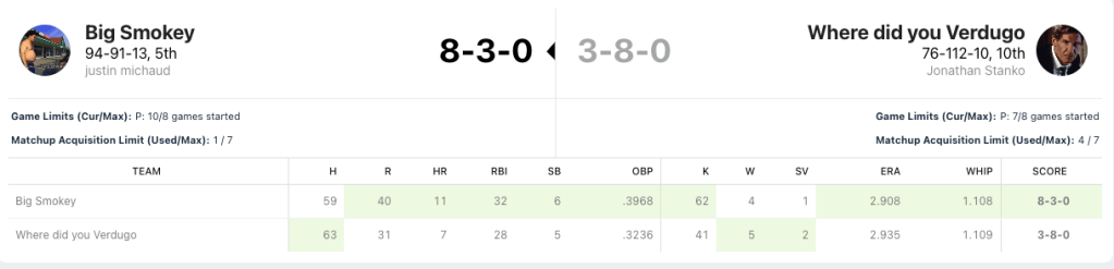 In terms of my matchup with Michaud. Let’s be honest, nobody cares except for Michaud. All I know is that I went to bed tied with him 5-5-1, and then I woke up losing 8-3-0. Again, the pitching rules that I was blind to benefits my opponent and brings him home with two extra categories that flipped late Sunday night.
