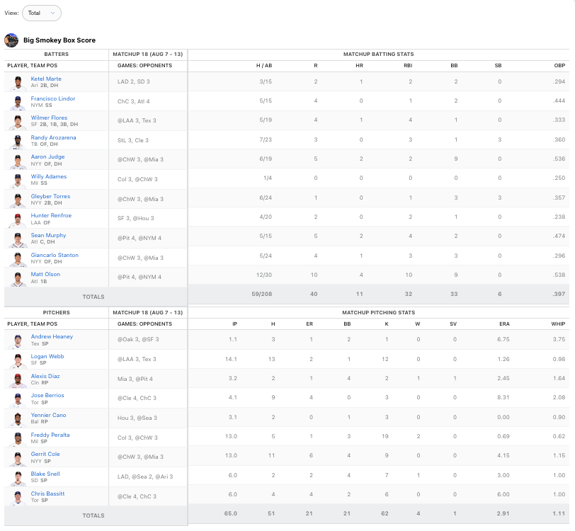 Michaud’s daily roster had an OBP of over .400 in three of the matchup’s first four days. The only day he had on OBP that was below .360 was on Sunday. Michaud’s team got on base plenty with 33 walks. He had more walks than strikeouts. Olson reached base 21 combined times between hits and walks. Not to be outdone in the free passes department, Judge also secured nine. When four players on your team had an OBP of .444 or higher in a single week, and each of them had 15 or more plate appearances, then you are going to be in a good place.