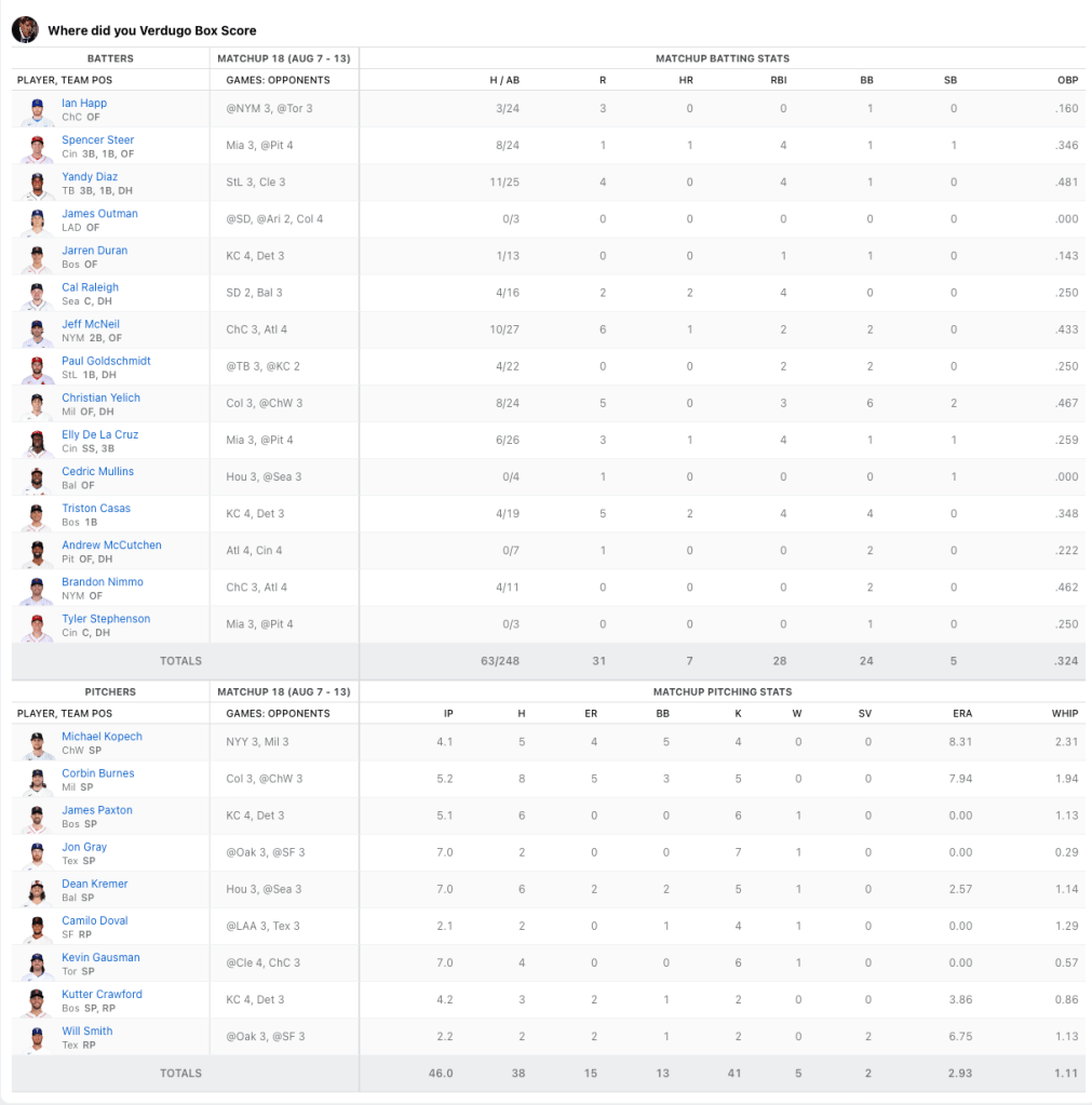 Love me a saving grace free agent signing. Jeff McNeil has basically been a late season call up for me just getting some playing time, but this week he was huge, having 10 hits for me. Yandy Diaz led my team with 11 hits. Having two batters get double-digit hits is huge, but eight hits from Spencer Steer and Christian Yelich also provided some necessary thunder.