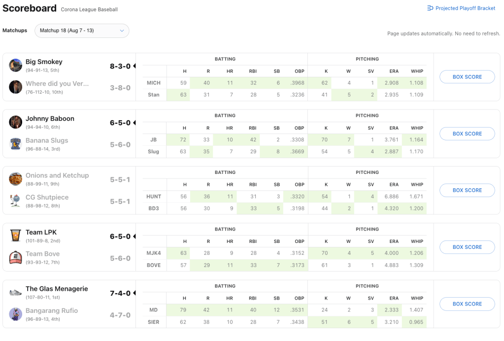 A quarter of Michaud’s runs were scored by one man. Matt Olson. Aaron Judge and Sean Murphy had the second most runs scored for Michaud, and that was five each. Michaud ended the week with 40 runs scored, and remarkably eight of them came on the final day to make the margin look far larger than it actually was.