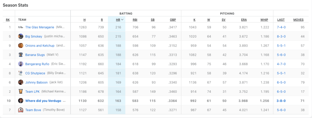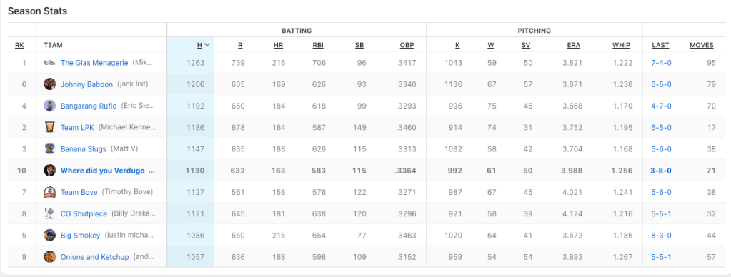 Love me a saving grace free agent signing. Jeff McNeil has basically been a late season call up for me just getting some playing time, but this week he was huge, having 10 hits for me. Yandy Diaz led my team with 11 hits. Having two batters get double-digit hits is huge, but eight hits from Spencer Steer and Christian Yelich also provided some necessary thunder.