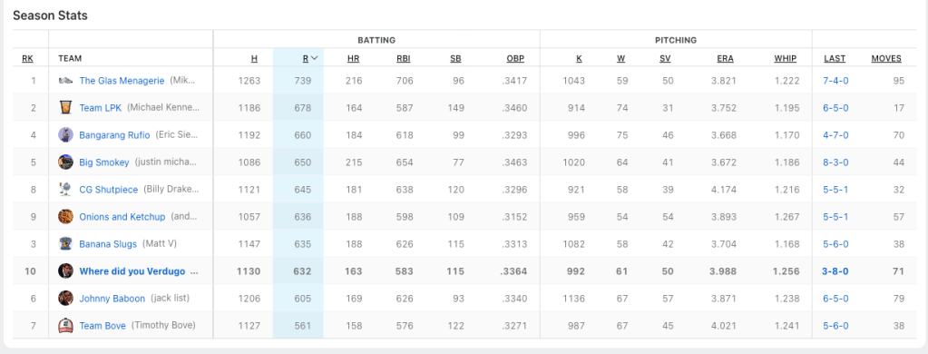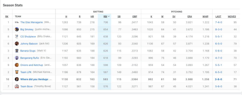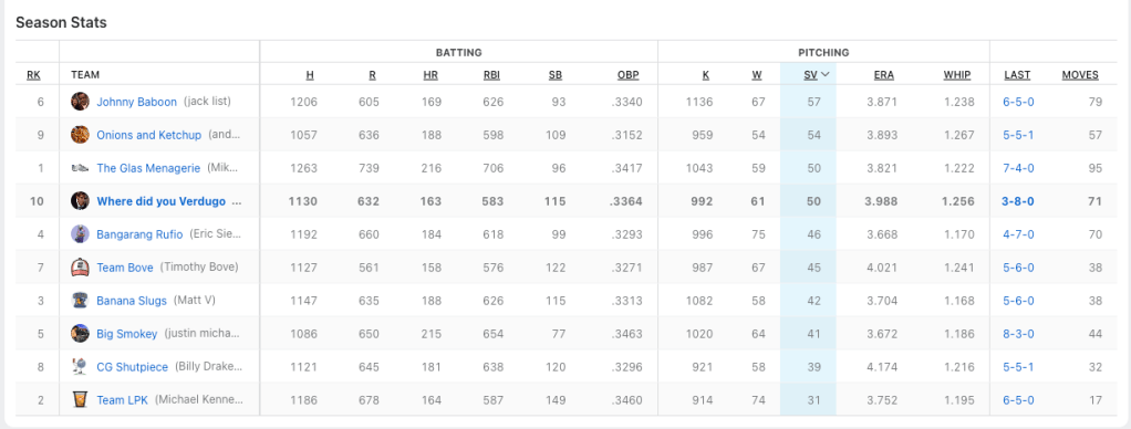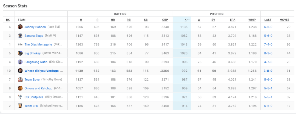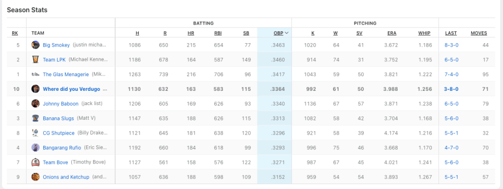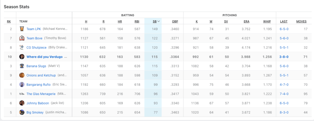 I had five stolen bases with Yelich having a pair of swipes. Not getting Jarren Duran on the bases really hurt my chances in this category. Also De La Cruz not knowing how to effectively work the count and loving to maintain a low OBP also hinders his potential speed impact.