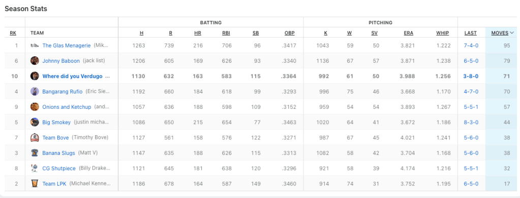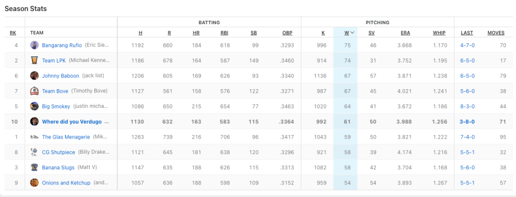 In terms of my matchup with Michaud. Let’s be honest, nobody cares except for Michaud. All I know is that I went to bed tied with him 5-5-1, and then I woke up losing 8-3-0. Again, the pitching rules that I was blind to benefits my opponent and brings him home with two extra categories that flipped late Sunday night.