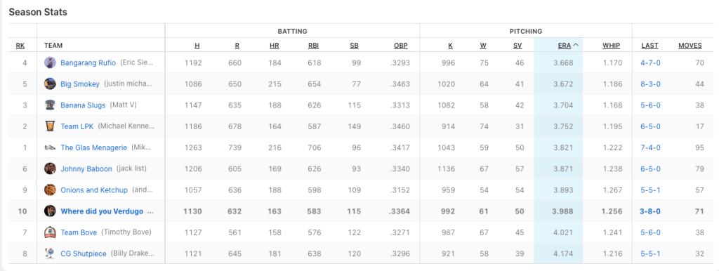 For me, my lonely self, I had James Paxton, Jon Gray and Kevin Gaussman combine for zero earned runs allowed over 19.1 innings. That is pretty damn good! It makes up for Michael Kopech having an 8.31 ERA this week. Or Corbin Burnes having a 7.94 ERA. Or Will Smith bringing home a 6.75 ERA.