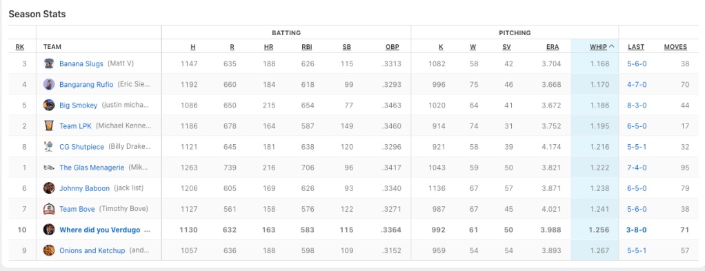 BY THE SKIN OF YOUR FUCKING TWAT. Are you serious? In the last category of my last “meaningful” match of the season I lost the WHIP by one thousandth of a decimal??