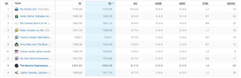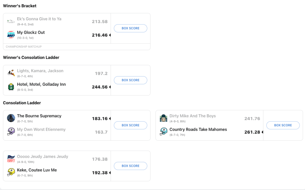 Perhaps Buzzi, T-Si, or myself will break away from the pack and be the first time three-time champion. A tall task, no doubt. Tommy has not won since 2017-18, and Buzzi since 2019-20. If I win, do I get to call myself a dynasty? No, no. Let’s not get too far ahead of ourselves.