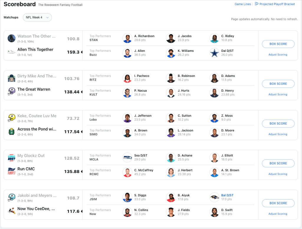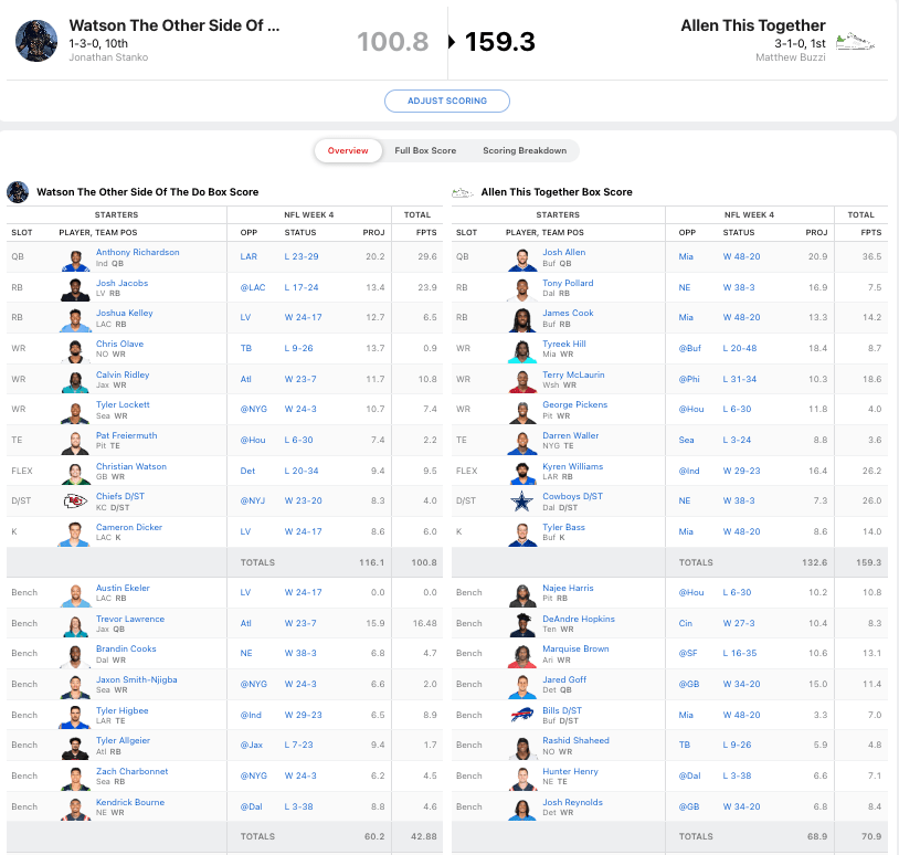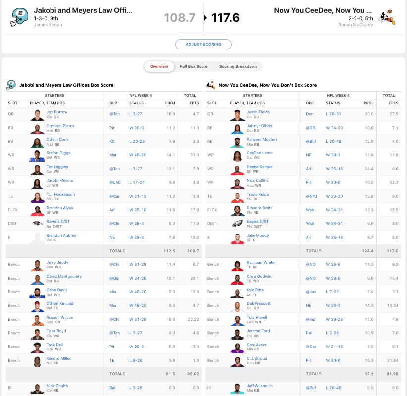Matthew McGinnityโs teams are averaging over 130 points per contest through four weeks, while T-Si is averaging below 110 points. It is a steep hill to climb, but T-Si may have a leg up because Justin Herbert (although hurt) and DK Metcalf are both on a bye. Means that McGinnity is going to need to dust off Tua Tagovalioa (oh boo-hoo) and whatever receiver he wants to plug in.