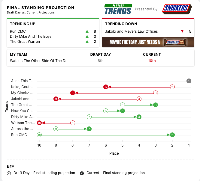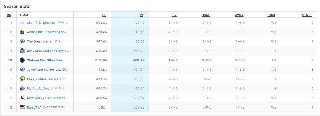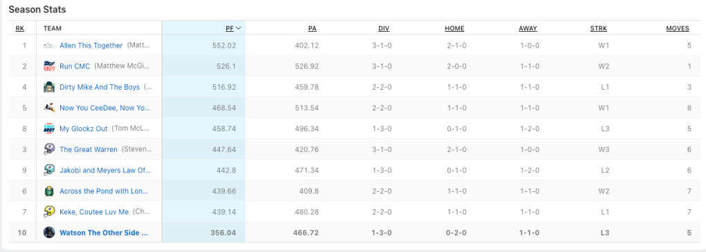 Christian McCaffrey had more fantasy points in the first half than all but one running back this week. I am pretty sure this is true, I heard it on a podcast so I want to believe it. When a player scores 45.2 points, you should definitely win your matchup. McGinnity has never been the best team of the week, but he has an argument to be the most consistent team thus far.
