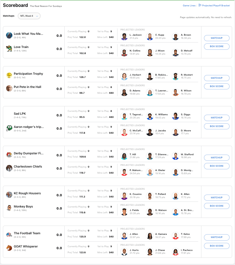 This is an exciting matchup. Eric has showed a great ceiling, but Andrew Huntley is the highest scoring danger in the league. Will he be able to rely on Jalen Hurt scoring well against the New York Jets defense? Will Eric have both Travis Kelce and Tee Higgins avaliable? This I think is going to be the most competative matchup of the week.