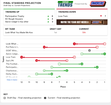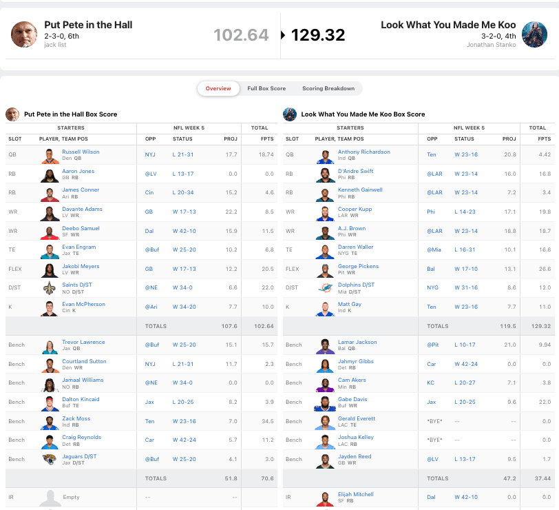 I consider myself lucky to have picked up the win against list. I had Anthony Richardson get hurt which is never ideal, but his lack of numbers was countered by Aaron Jones not playing on Monday night and James Connor getting hurt. The craziest part of my box score is George Pickers somehow scoring 26.6 points in a truly ugly low scoring game.