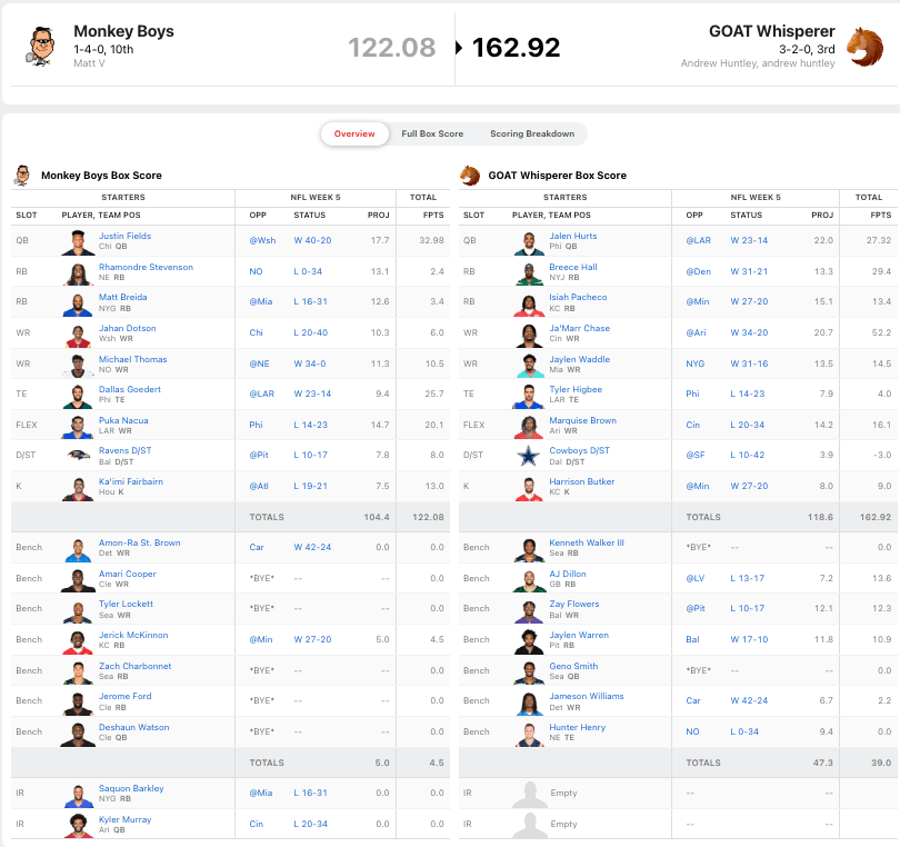 Vaghi did the best he could with five players, and at least one starter on a bye. It is the running backs that are killing Matt. 5.8 combined points from Rhamondre Stevenson and Matt Brieda. Outchy mama.