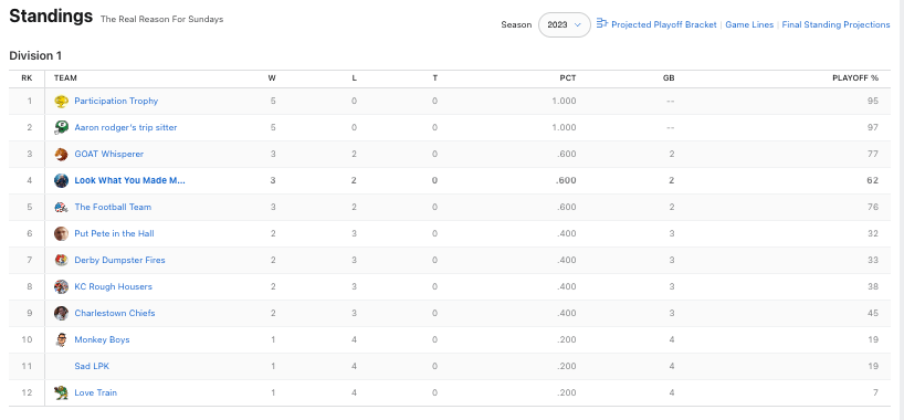 Second blowout of the week. Gabe improves to 5-0 with a searing victory over Timmy. Gabe had to think he was all set for success after Thursday when DJ Moore had the best wideout effort by anyone thus far this season. 50 points is a nice head start. Gabeโs iffy QB situation of C.J. Stroud and Kenny Pickett didnโt affect him at all this week. Also, it is nuts that the 49ers beat the Cowboys so bad and Christian McCaffrey only had 13.8 fantasy points.