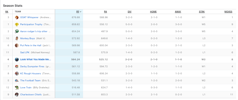 A third straight blowout to touch on. This time around it is Eric defeating Michaud. Eric had three players score 20+ points while Michaud had just one. Josh Allen, Adam Thielen and Travis Kelce carried the banner for Eric. How about Thielen just leeding the way for the Panthers; he has 100+ yards twice this second and in both of those games he had 13+ targets and a touchdown.