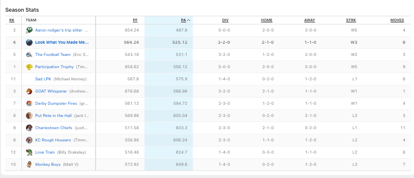 Gabe is in the best of both worlds: he has the third most points and least amount of points against.
