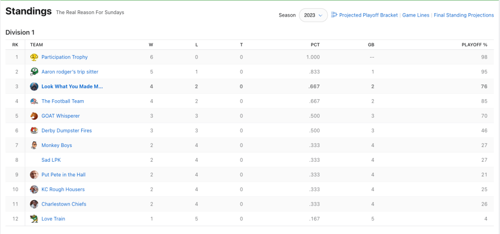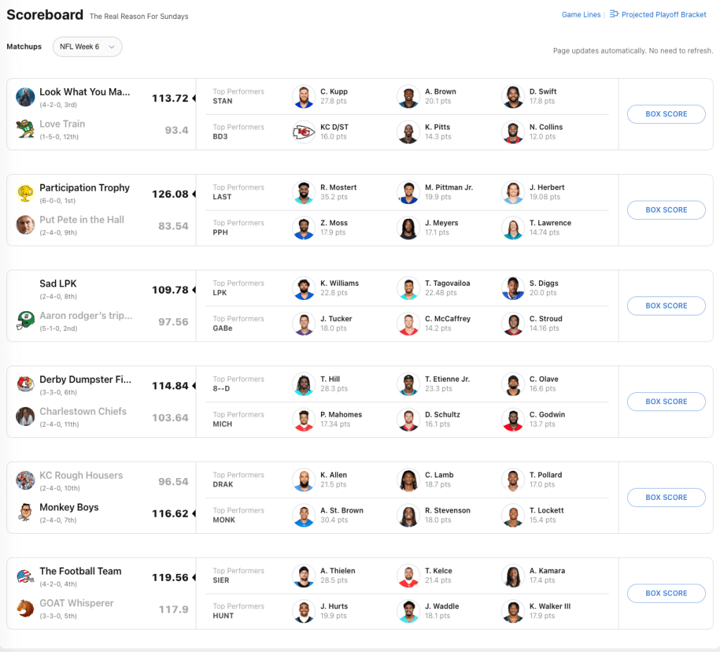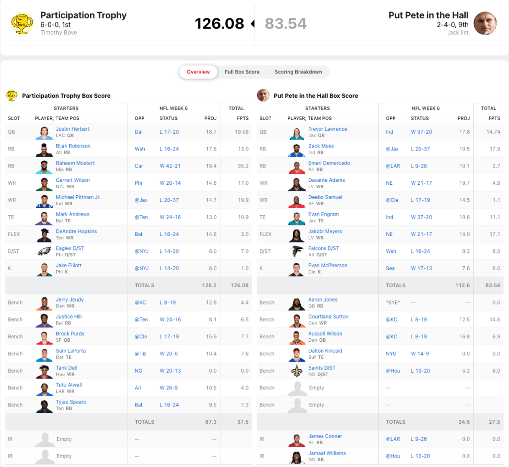 Bove improves to 6-0 with a dominant win over Jack List. The 42.54 points was the largest margin of victory in week six. Having Raheem Mostert helps Bove elevate to the lone position in first place. Mostert is the RB2 in all of fantasy. I heard a great stat that the Miami Dolphins running backs are averaging more yards per carry than Patrick Mahomesโ average yards per attempt.