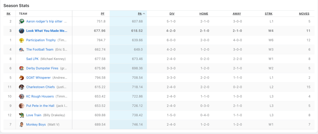 I am in a bad mood, so I donโt have much to say about this league. The man is beating me down. But I am not as down bad as Huntley is. Brother, this season has been a impolite slap in face to your drafting and managerial prowess.
