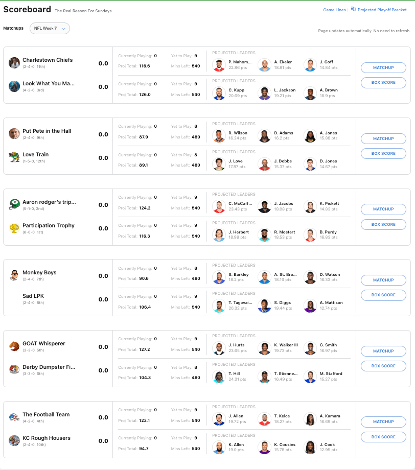 Jack List scored the least amount of points this week. Never would have thought that Davante Adams and Deebo Samuel would combine for 6.0 points. Jack does have two open bench spots though. He can get frisky adding free agents for this week. May need running backs if Zack Moss finally gives way to Jonathan Taylor and if Emari Demercado tosses up another stinker.
