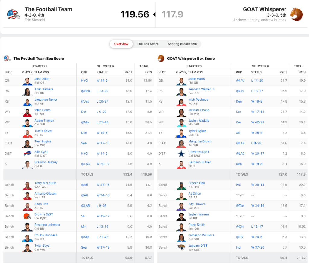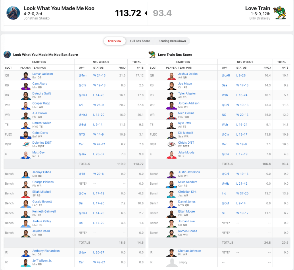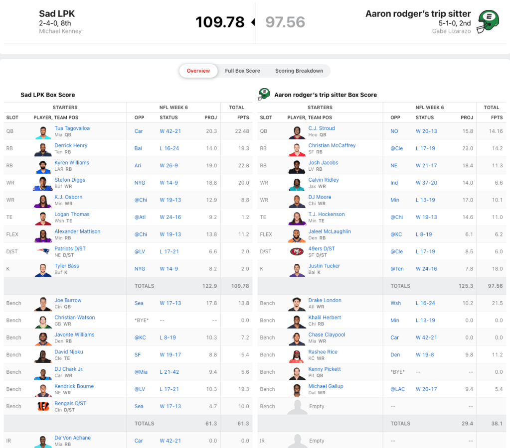 Tua Tagovailoa, Kyren Williams and Stefon Diggs all scored over 20 points for Kenney, and that proved to be enough to take down the previously undefeated Gabe Lizarazo. Sure, maybe Gabe was hurt a bit by Khalil Herbert being out, but otherwise it was just a depressing outing from the squad. Justin Tucker was Gabeโs highest scorer with 18.0 points.