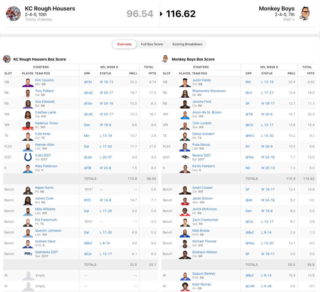 Timmy Drakeley was hoping that getting Keenan Allen back from his bye week would rejuvenate his team. Allen did his job with 21.5 points, but nobody else seems to have gotten the memo. The only other double-digit performers on his team were both Cowboys; Tony Pollard with 17.0 points and CeeDee Lamb with 18.7 points.