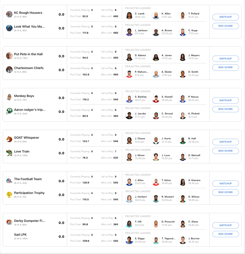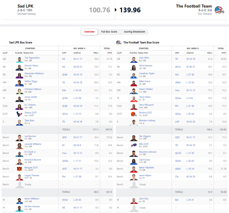 Eric took a chance on two running backs, and both are paying off. Jonathan Taylor and Alvin Kamara combined for 37.7 points. Since coming back Kamara is averaging 22.8 points per game, and he ranks sixth among all running backs. What a find. Josh Allen did set the tone nicely on Thursday with 29.06 points, and even Mike Evans contributed with 12.9 points. Eric put team Sad LPK behind the eight ball right from the start.