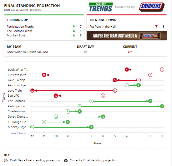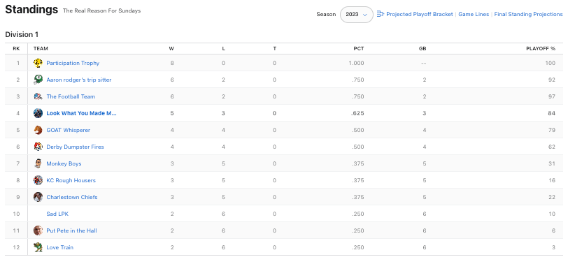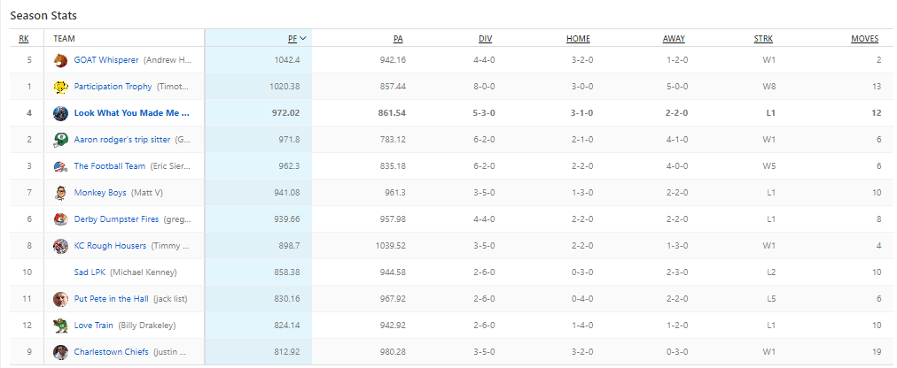 We turn the page on a new month of the calendar year and now there are six weeks left in the regular season. If you look at the standings and the playoff% column, ESPN seems to think that the race is a fait accompli. Well, at least when it comes to the first three playoff spots. Bove, Gabe and Eric are all above 90% already to make the playoffs. It is fair to say that Tim is sitting pretty with a still unblemished record, but I think it’s still premature to say the pedestal is locked in.