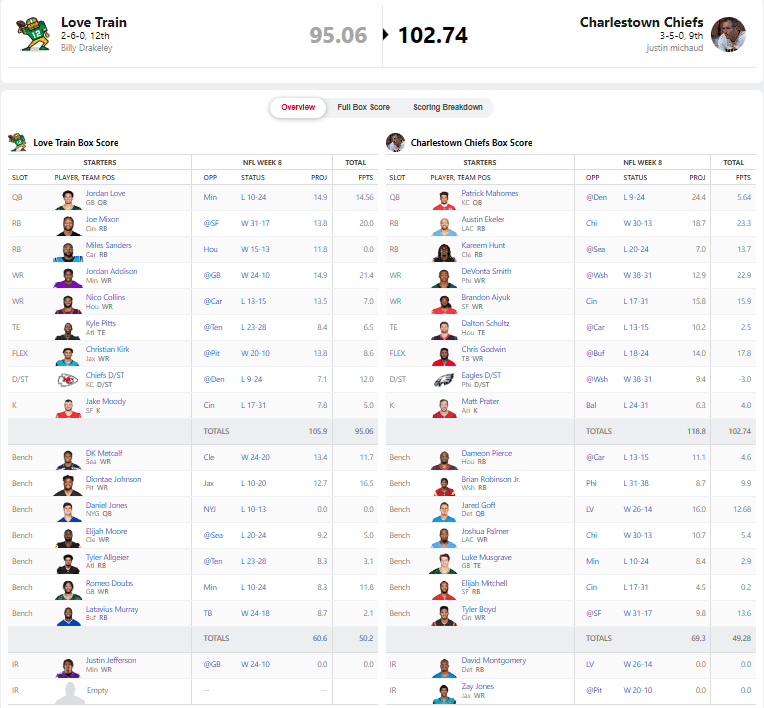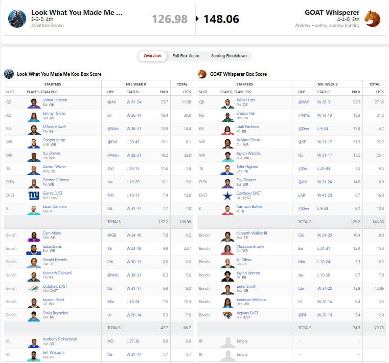 A low-scoring, but close contest. This was the NYJ vs. NYG of this fantasy league. Michaud was able to come out with the saggy W because Austin Ekeler went off on Sunday night for 23.3 points. Also helps that DeVonta Smith had his first 20+ points game since week two, and first 10+ point game since week four. The Eagles dropping a negative three point total didnโt sink Justin either.