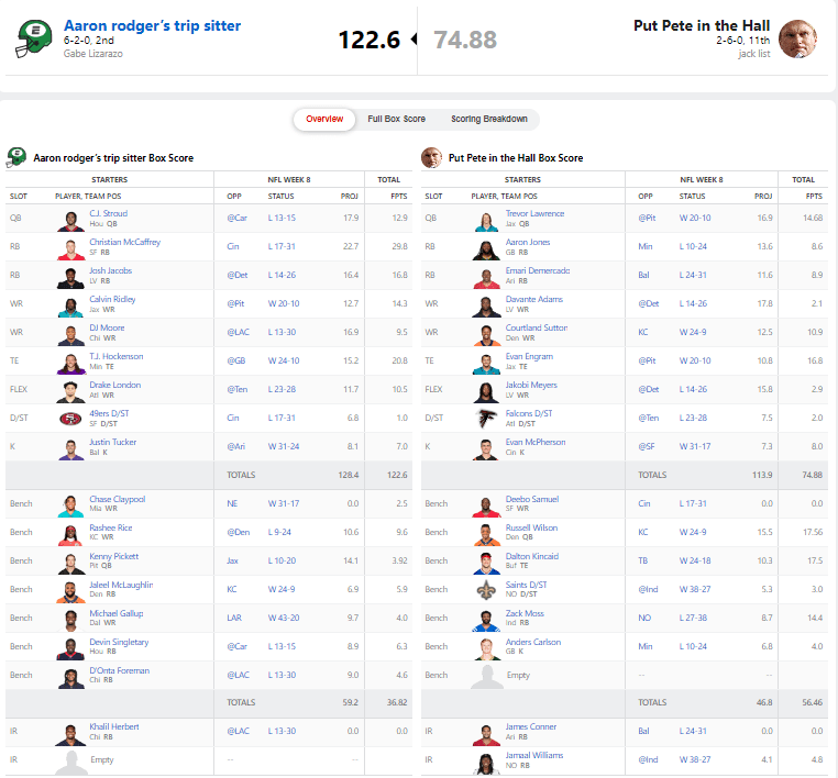 Gabe, still riding the CJ Stroud band wagon (though it has gotten wobbly), improves to 6-2 on the year. The wide receivers for Gabe combined for the second fewest points in the week, but it was still good enough to take down the team that had the fewest wide receiver points of the week.