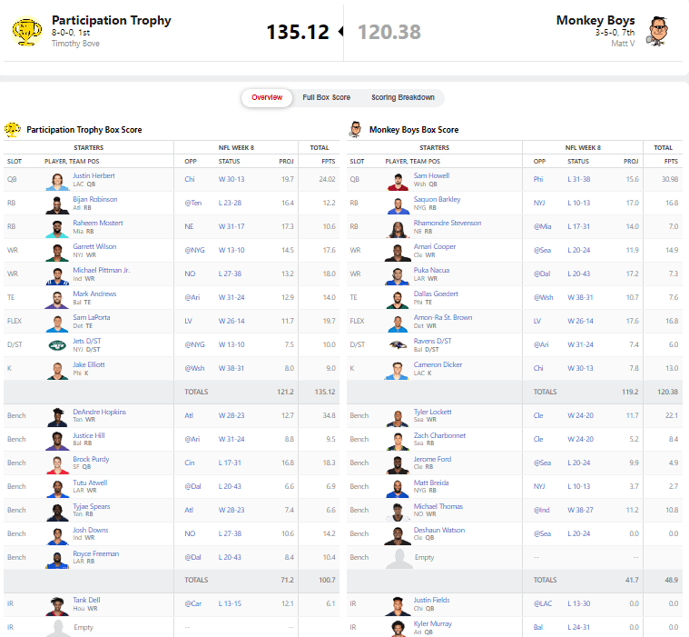 Come on Lamar Jackson. You only scored 11.98 points against the Arizona Cardinals? Ugh, and Cooper Kupp had a shit game too. Oh, and Darren Waller hurting his hamstring in the first quarter. A receipt for success. I have two positive takeaways from this game; Jahmyr Gibbs is really proving himself as an RB1 option, and AJ Brown has an argument to be the ebay wide receiver in the NFL.