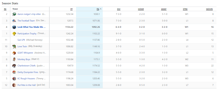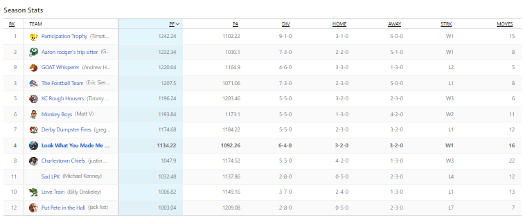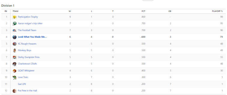 Back to the playoff picture. I think it’s safe to say that Bove is in the playoffs, along with Gabe and Eric. There is going to be a fight for the bye, but I think it’s safe to say that Bove is guaranteed a bye. Gabe got the better of Eric this week, but they are two equally dangerous teams.