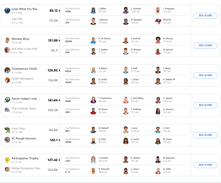 Amon-Ra St. Brown is a dawg. That is Dan Campbell speech. He had a season-best 30.5 points against the Los Angeles Chargers. Tyler Lockett also had his second best week of the season at just the right time. Vaghi improves to .500 and currently resides in the final playoff spot.